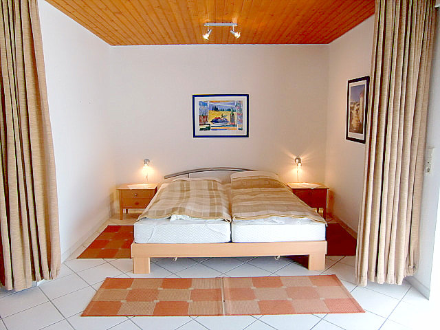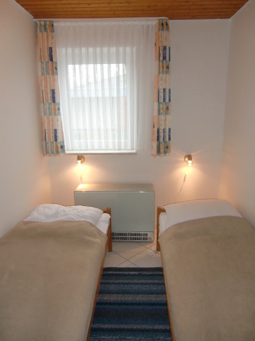 * Separates Zimmer * Zwei Einzelbetten ( 80 x 200 cm) ohne Fußkante * Synthetische Kissen (80 x 80 cm) und synthetische Oberbetten (Decken 135 x 200 cm) * Verdunkelung durch Rolläden im Erdgeschoß * Gefliester Fußboden im ganzen Bereich, mit aufgelegten Teppichen * Holzvertäfelung an allen Decken des Hauses |